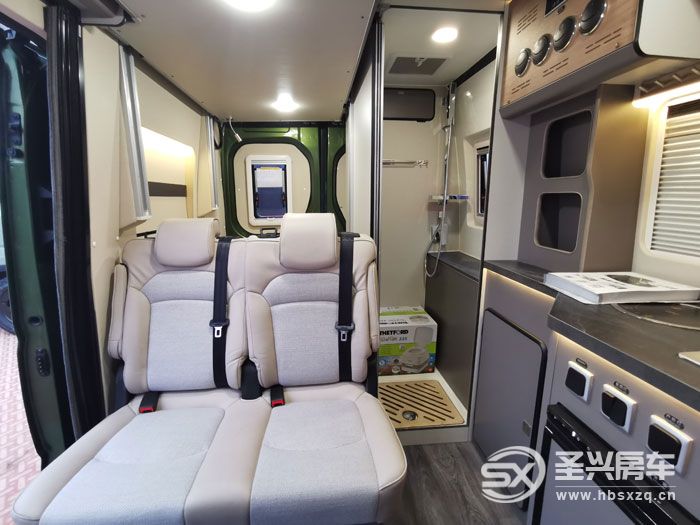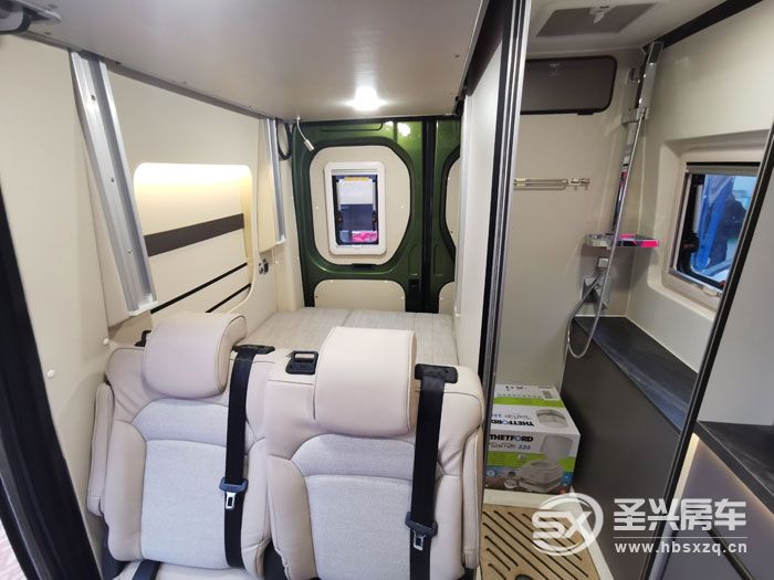 短軸房車內部往往都是采用緊湊型布局,這款也不例外。駕駛艙1+2能坐下3人,后部會客區雙人座椅全車荷載5人。前后排座椅中間設計有餐桌,內側設計為多個功能組合柜,配置也不少,有電磁爐、洗菜盆、65L車載冰箱、上部還有一臺24V直流變頻空調。