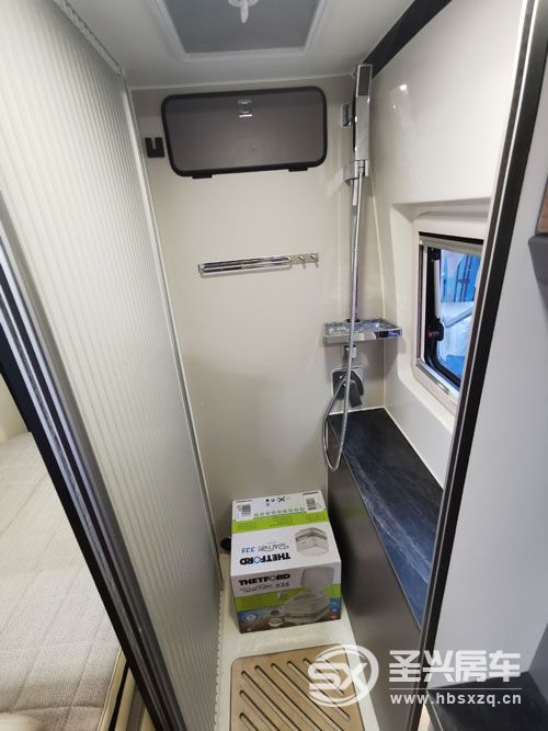 衛生間外部設計有卷簾門,配有便攜式馬桶、淋浴花灑、毛巾架、側面有外推出頂部有換氣扇。水路系統配有100L凈水箱以及50L灰水箱。