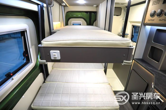 短軸房車想要獲得更舒適的休息床位,縱置上下床的設計無疑是個好選擇。結合車內第二排座椅可拼成一張尺寸是1900*1000毫米的單人床,上鋪是一張電動吊床尺寸是1900*900毫米。綜合配置方面:400ah鋰電池、200w太陽能、3000W逆變器、入門款為200ah膠體電池及智能房車用電管理系統,同時該車還配有5KW柴油暖風熱水一體機、柴油霧化爐等。
