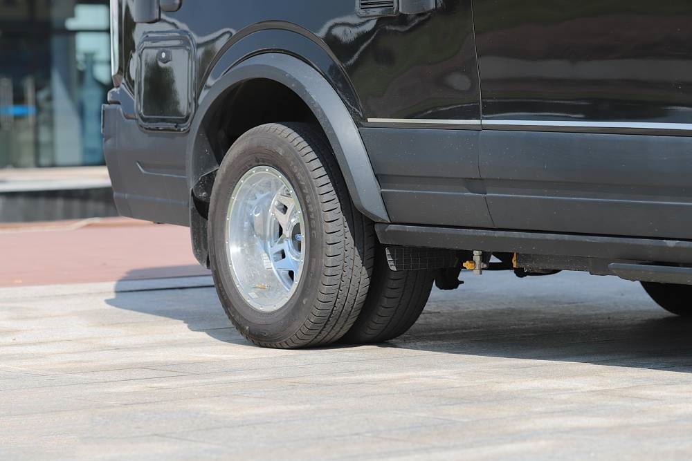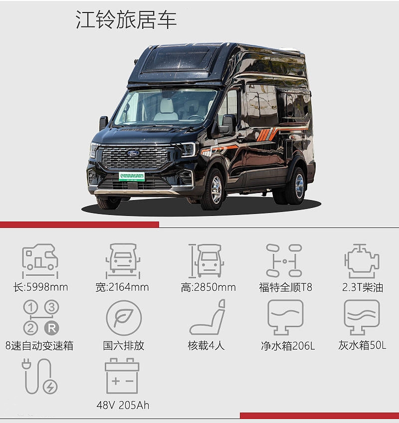 整車尺寸為5998x2164x2850 (mm),額定載客4人,輪胎尺寸為195/75 R16,油箱容積80L,動力上搭載2.3T福特PUMA高壓共軌柴油發(fā)動機,最大功率128kW,最大扭矩430N/m,匹配采埃孚8AT變速箱,滿足國六排放標(biāo)準(zhǔn)。