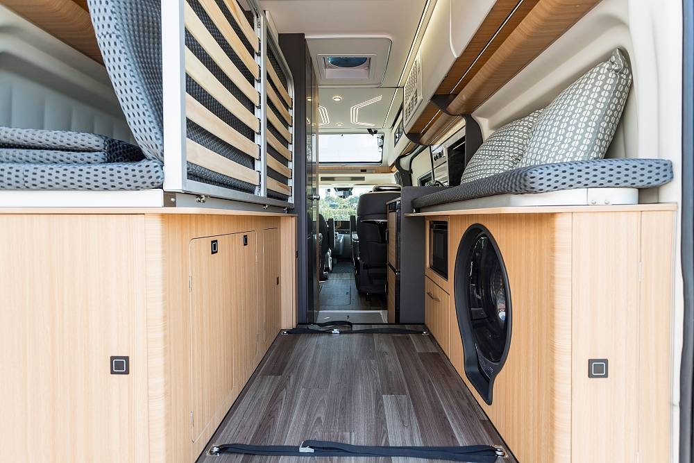 尾部翻折橫床尺寸為2000×1300(mm)容納兩名成年人完全沒有問題,床鋪中間部分可上翻,形成前后貫通式走廊,兩側(cè)窗戶處改為封閉結(jié)構(gòu)并進行了軟包處理,并留有閱讀燈及各種氛圍/射燈照明。