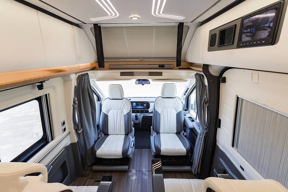 車廂內(nèi)部以灰白+米白木色搭配為主,會客區(qū)大量采用超纖包覆,觸感細膩溫和并且易于清潔和保養(yǎng),營造出一種高級、優(yōu)雅、輕奢的氛圍。擁有同級最寬的56cm過道,車內(nèi)動線合理保證人員前后自由穿梭, 1.85m的越級內(nèi)高帶來不輸無拓C型的內(nèi)部空間感,大幅優(yōu)于傳統(tǒng)B型房車,無疑對居住舒適度有著飛躍式的提升
