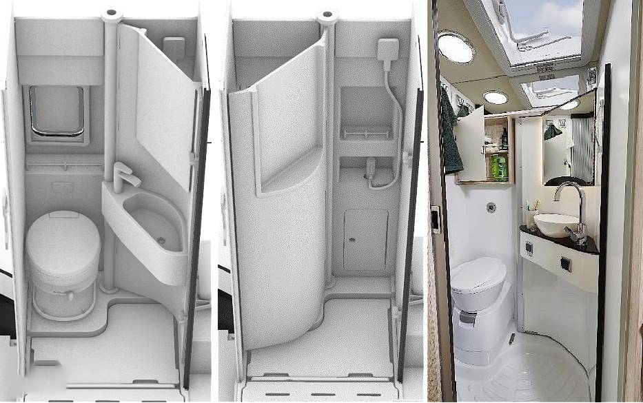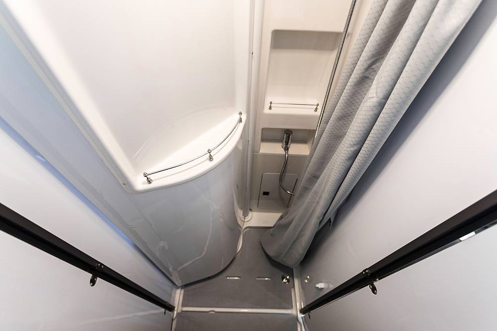 沒看到福特T8實車前我就非常好奇一輛B型房車怎么實現(xiàn)衛(wèi)生間的干濕分離,當(dāng)真站到實車中看到實現(xiàn)的方法時,心底頓時對設(shè)計人員的靈巧構(gòu)思感到佩服,過道空間雙重利用,解決了過道狹窄和衛(wèi)浴空間不足的傳統(tǒng)痛點,一舉兩得。