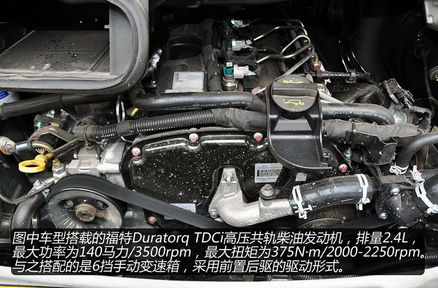 福特新世代全順原型車是歐洲福特全順系列的最新車型,是目前歐洲輕客的主流車型,榮獲2007年度“歐洲商用車大獎”等殊榮,世界輕客產品的“柴油化、轎車化、安全化、環保化”的“四化”趨勢,在福特新世代全順上得到良好的體現。在動力、空間、舒適、操控、承載等方面,福特新世代全順均突破了以往輕客的標準,為行業樹立了新標桿。福特新世代全順首次采用多項國際領先技術,創造了很多輕客行業的第一。該車裝備福特原廠2.4升DURATORQ TDCI高壓共軌柴油發動機,最大功率可以達到103千瓦,能持續輸出370Nm的最大扭矩,排放滿足歐三或歐四標準,為目前輕客行業動力、環保性能最佳的產品。為了匹配這款大扭矩大功率發動機,福特新世代全順匹配了一款6速手動變速箱。大大提升了行駛舒適性和平順性,實現動力輸出更加高效綿密、換擋平順省力、低檔起步更有力、傳動比分配符合最佳的經濟性曲線從而更加省油。