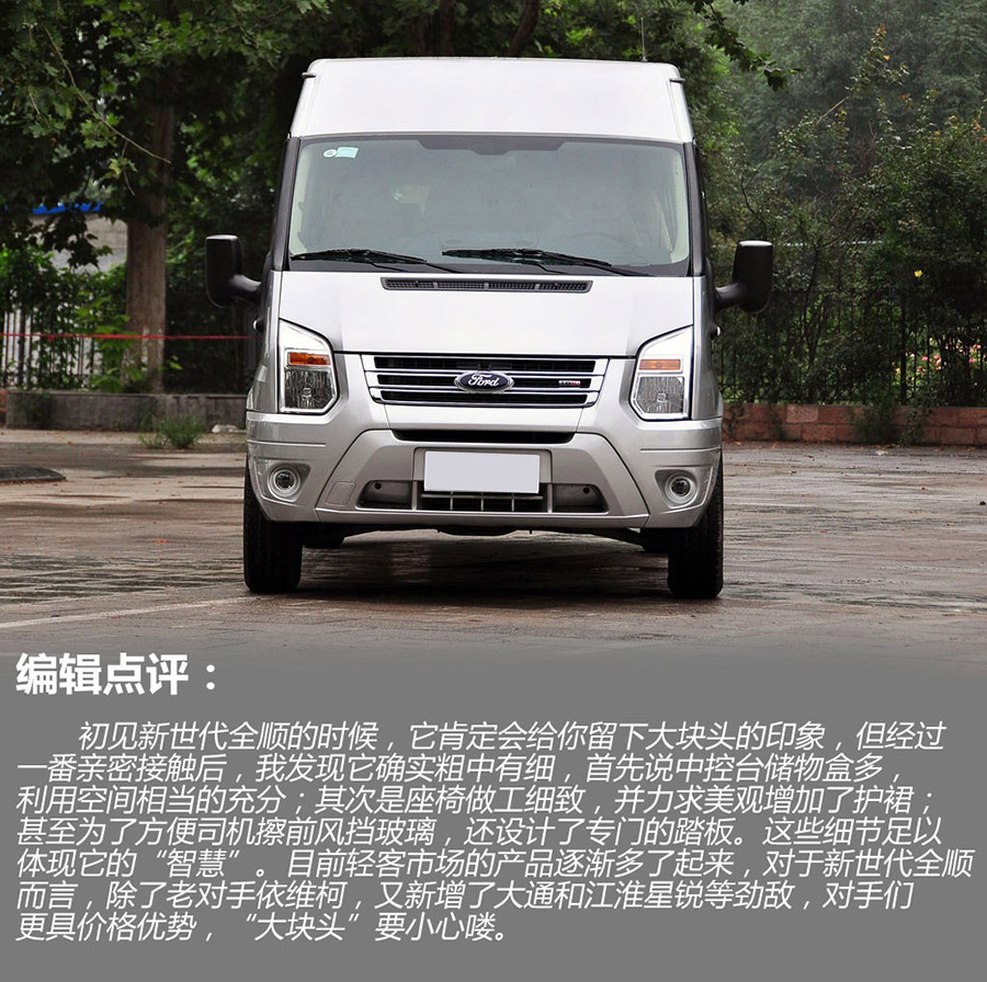 福特新世代全順的外觀設計簡潔時尚,配置實用,綜合性價比較高,動力較好,提速快;操控性較不錯,換擋順滑;燃油經濟性不錯。