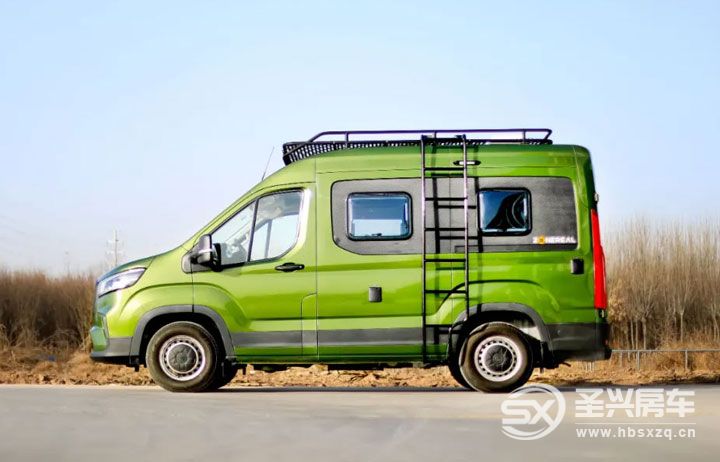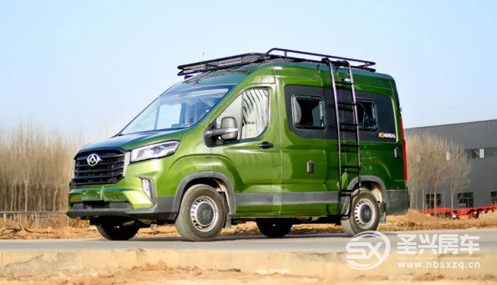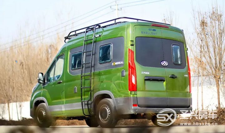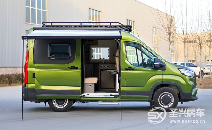 獵裝版車身高度為:2755mm,屬于高頂車型,車頂配備了定制行李架和側面爬梯架,車頂行李架集成了200W太陽能電池板和LED高亮度射燈,可以在車頂遠眺風景的同時提供更好的安全行車照明。 標配了手動遮陽棚,延展尺寸為3000×2500(mm)。