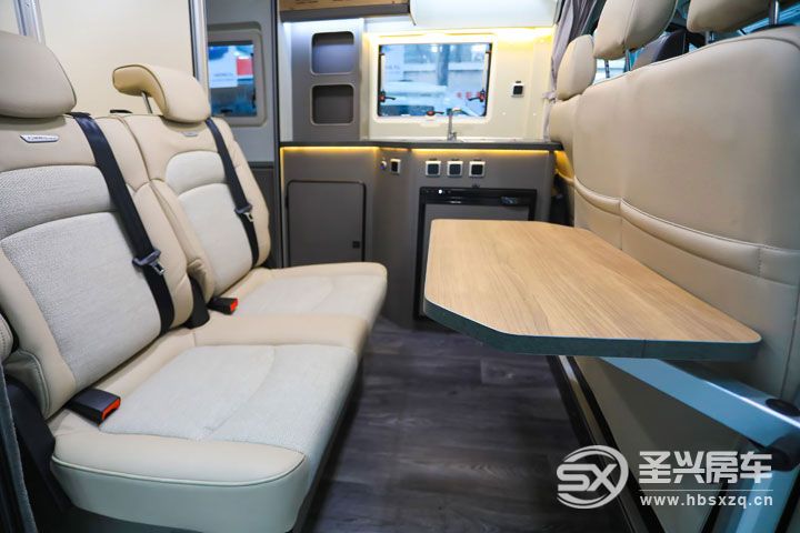 車內設備配置齊全,內飾布局合理。把有限的空間利用到極致,駕駛室、會客區、室內外廚房區、衛浴區以及睡臥區完美的進行了融合。