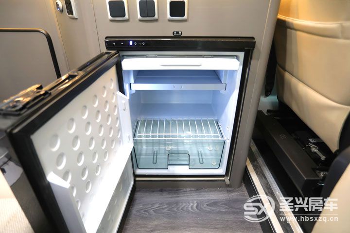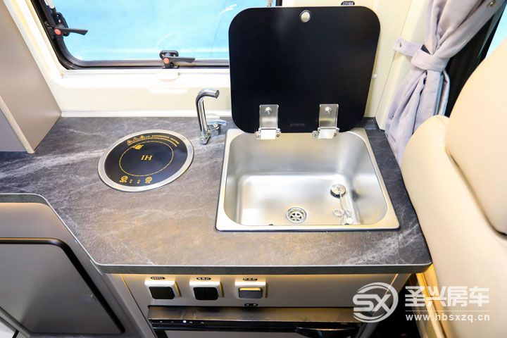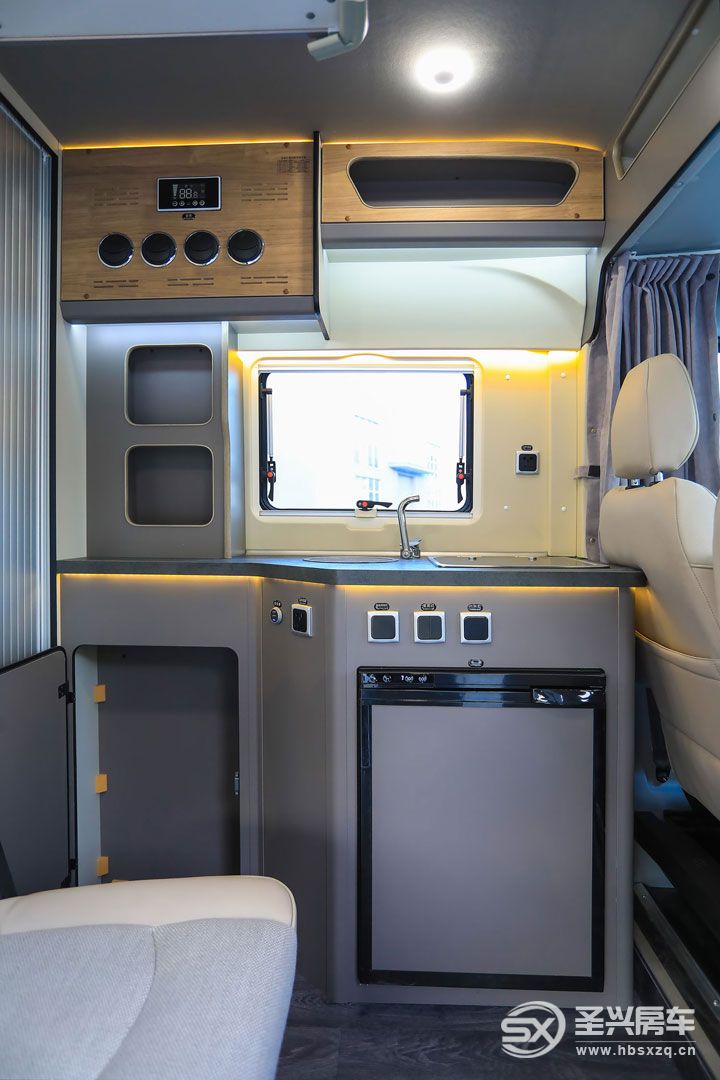 室內廚房部分設置有電磁爐、洗菜盆、65L房車專用12V冰箱,廚房上方設有220V插座和大尺寸車窗,頂棚設有一個開放式吊柜,吊柜一側是高效能24V直流變頻空調,下方是儲物格和地板落地式超大儲物柜。