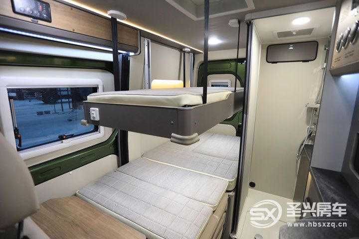 獵裝版車型配有電動升降床,上鋪尺寸為:1900×900(mm),下鋪可通過折疊后排座椅形成一個尺寸為:1950×1000(mm)的常態床。