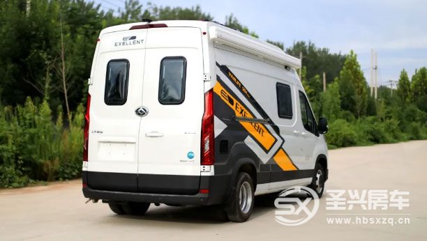 車身外觀采用拉花設計,簡約低調,整車尺寸為:5940 x 2110 x 2780(2980)mm。主駕駛一側標配:重力注水口和220V市電接口。入戶門一側配備:戶外廚房柴油霧化爐裝置、3000X2500(mm)遮陽棚、房車專用紗門、房車專用踏步;車體兩側均設有戶外照明燈,車頂為太陽能電池板及衛浴間雙向換氣扇,尾門可呈180°開啟。