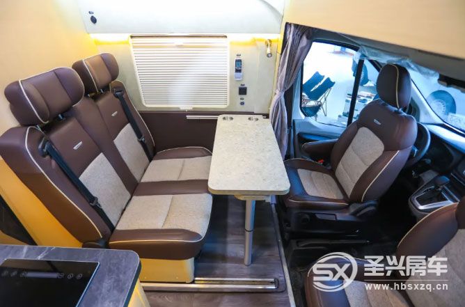 會客區采用的是長途舒適座椅(雙座/靠背角度可調),進口皮尤材質乘坐感非常舒適,空間也很寬敞,與前方主副駕駛座椅搭配,滿足4~6人聚餐或者會議。并且座椅還可以放平,無論是坐著躺著都很舒適,更不怕長途旅行。