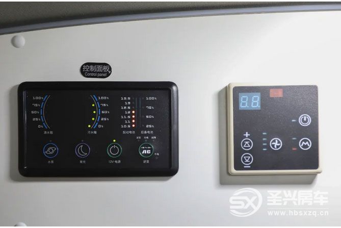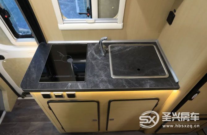 廚房區,由多功能料理臺和儲物柜組成,配備了房車專用洗菜池+水龍頭、直流12V房車專用50L冰箱、電磁爐(含柜體改造)。燈光控制按鍵組合也安裝在這里。