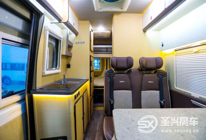 周邊還標配了游艇級閱讀燈、房車專用折疊電視支架及12V房車專用電視19寸、USB充電插口、220V插座,上方還有儲物吊柜和氛圍燈。
