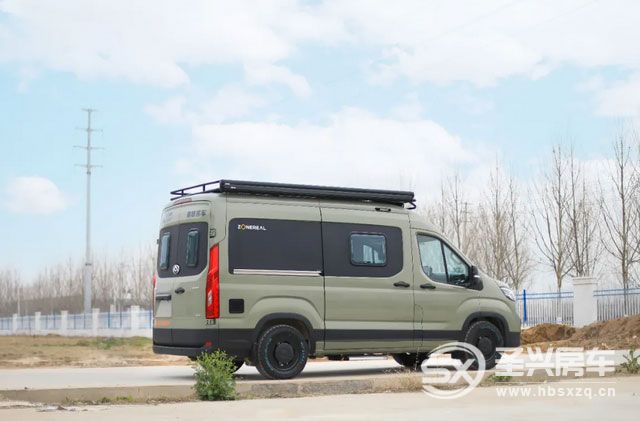 為了更適合戶外野營生活,這款車還配備了2800X1700mm定制的行李架和側面爬梯架,車頂行李架集成了200W太陽能電池板和LED高亮度射燈。