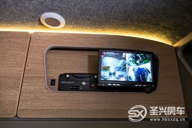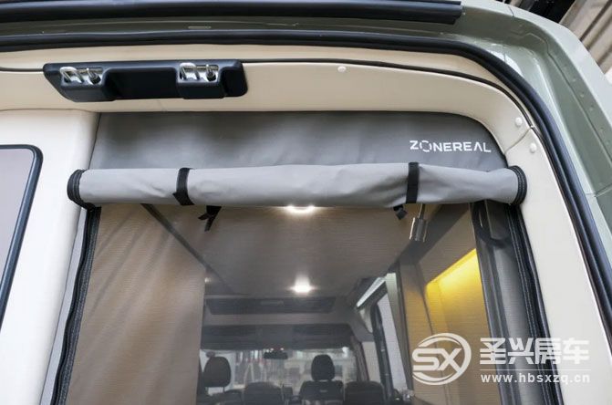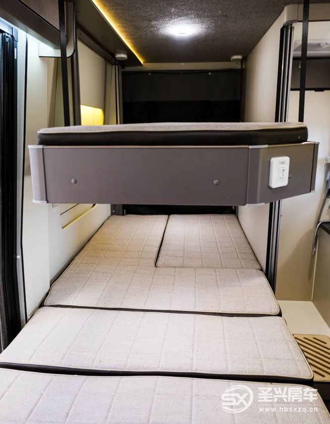 儲物/睡眠區: 白天是雙人座椅,晚上座椅放倒,與后方床鋪形成2050×1100(mm)的常態床,上鋪是2000×1000(mm)電動升降床。下方是大尺寸儲物空間。