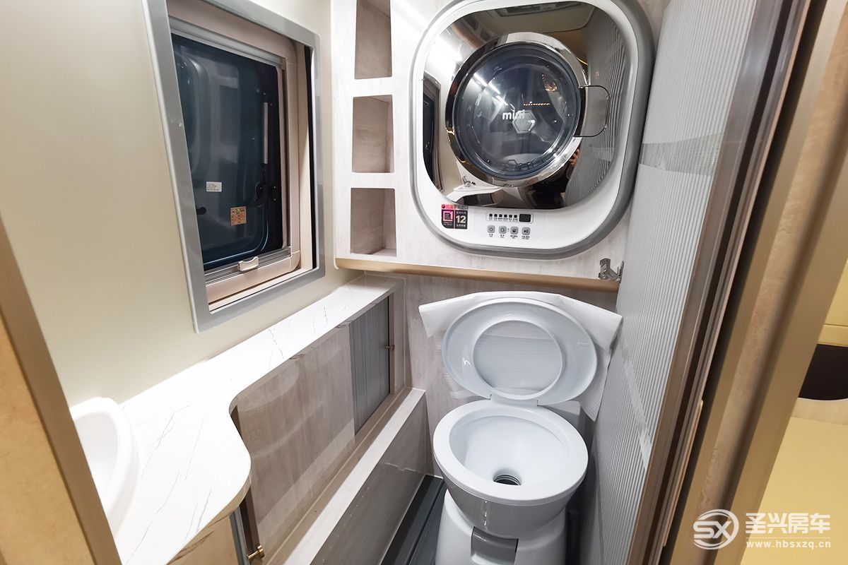 新車衛(wèi)浴間采用縱向布局,以節(jié)省車內(nèi)空間,主要配置包括多美達電動馬桶、扇形洗臉池、肥皂盒、牙杯架、衛(wèi)生紙架、洗衣機、淋浴花灑、浴巾架和化妝鏡,日常使用完全夠用。除此之外,衛(wèi)浴間頂部還配備了韓國大宇mini洗衣機,解決了用戶換洗衣物的問題。