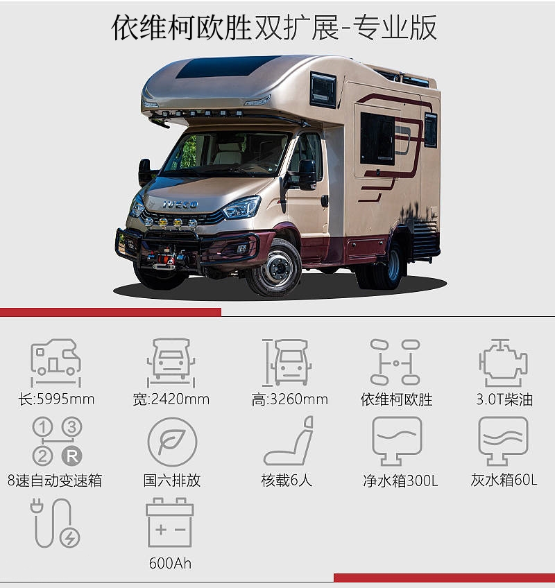 整車尺寸為5995x2420x3260(mm),軸距為3300mm,輪胎尺寸為225/75 R16LT,動力系統是代號F1CE8481K的3.0T柴油發動機,最大功率為125千瓦,峰值扭矩為400牛·米,并滿足國六排放標準,具有低速高扭、低油耗、低噪音、低排放等優點,與之匹配的是8速自動變速箱,可以實現平順的換擋和優化的動力輸出。
