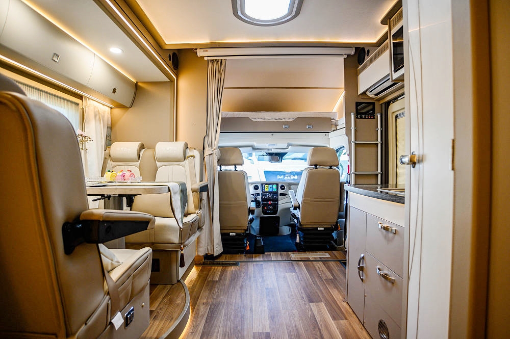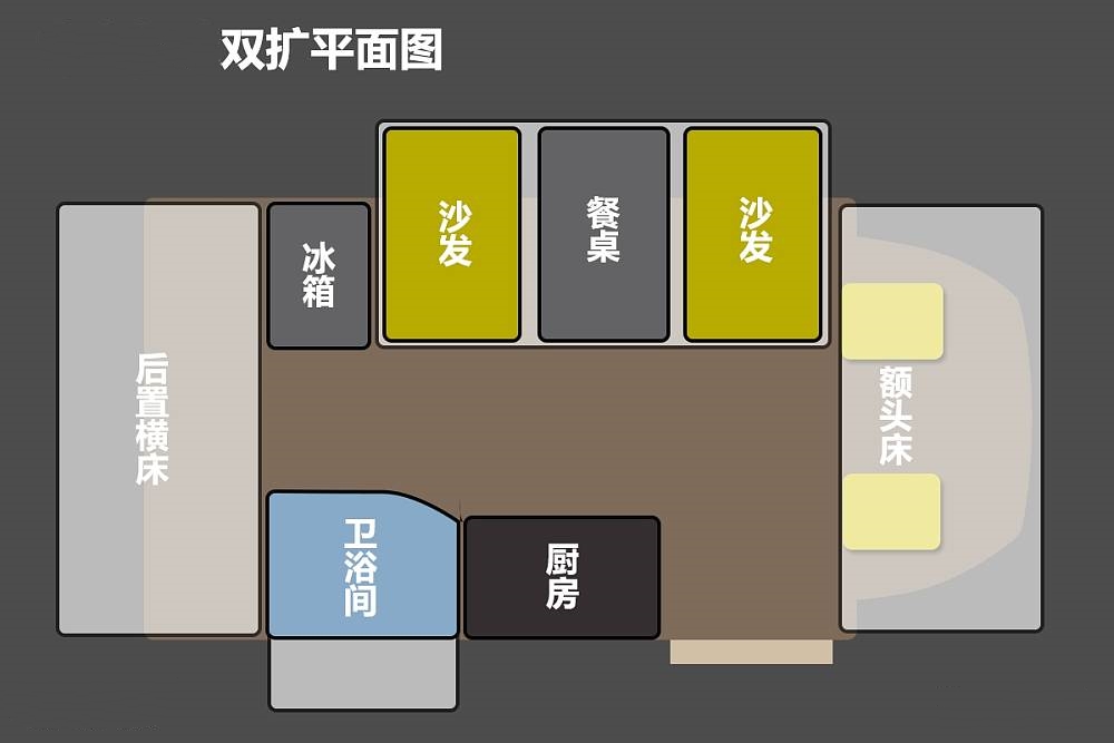 從前到后的布局依次為駕駛室+額頭床、會客區+沙發床、廚房區、衛浴區以及后置拓展橫床,布局形式充分利用大尺度車廂空間,整車內部空間寬敞舒適,可滿足六人在車內同時起居,各項功能區的劃分也比較規整。