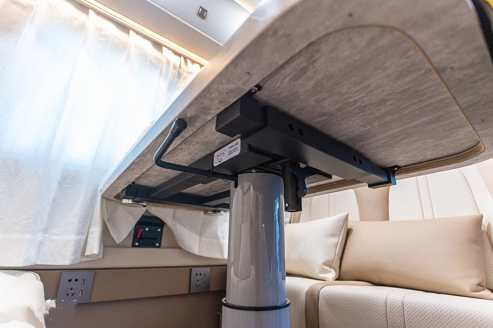 中間為一張氣動升降餐桌,設有杯槽,操作便捷。將升降桌降下后可以與對卡座拼成一張臨時床鋪睡臥使用。