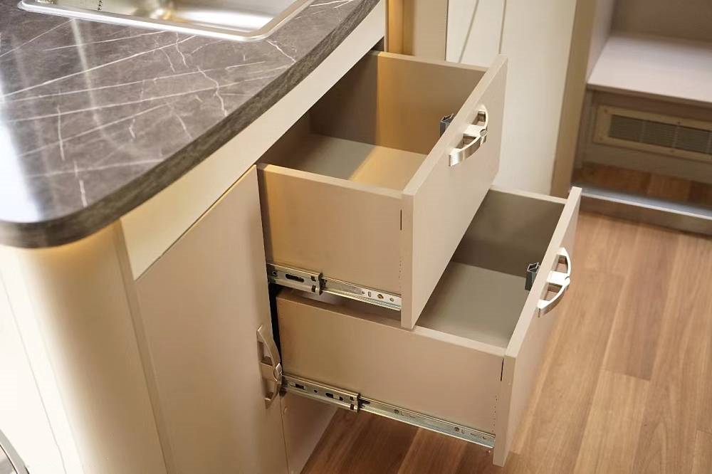 臺面下方可選裝2.8kg洗衣機,由于會占用一定櫥柜空間,所以電路檢修區設置在了櫥柜內部,此外,儲物柜的多層抽屜也經過精心設計,提供了充足的收納空間。不同深度的抽屜方便分區放置廚房用具、餐具以及各種食材調料