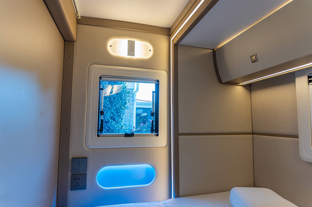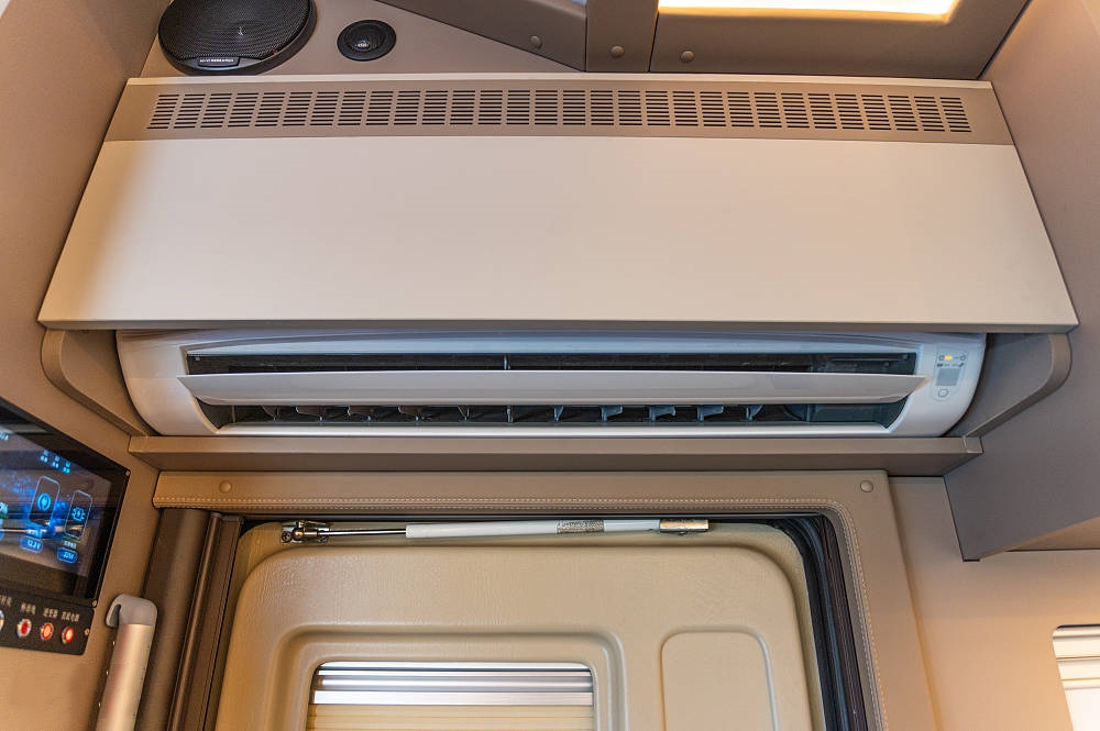 車廂進門上方吊柜中內嵌有一臺家用變頻空調,應用在房車這樣面積可控的空間內,可快速安靜的調控車內溫度,避免忍受酷熱夏日較長時間的降溫過程。