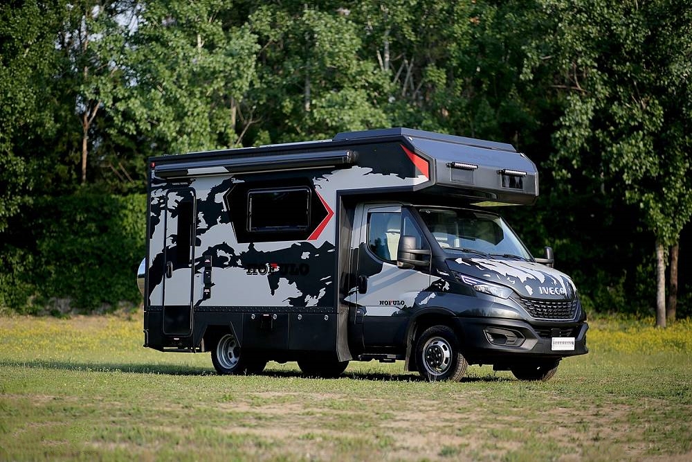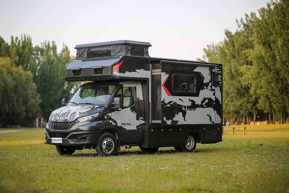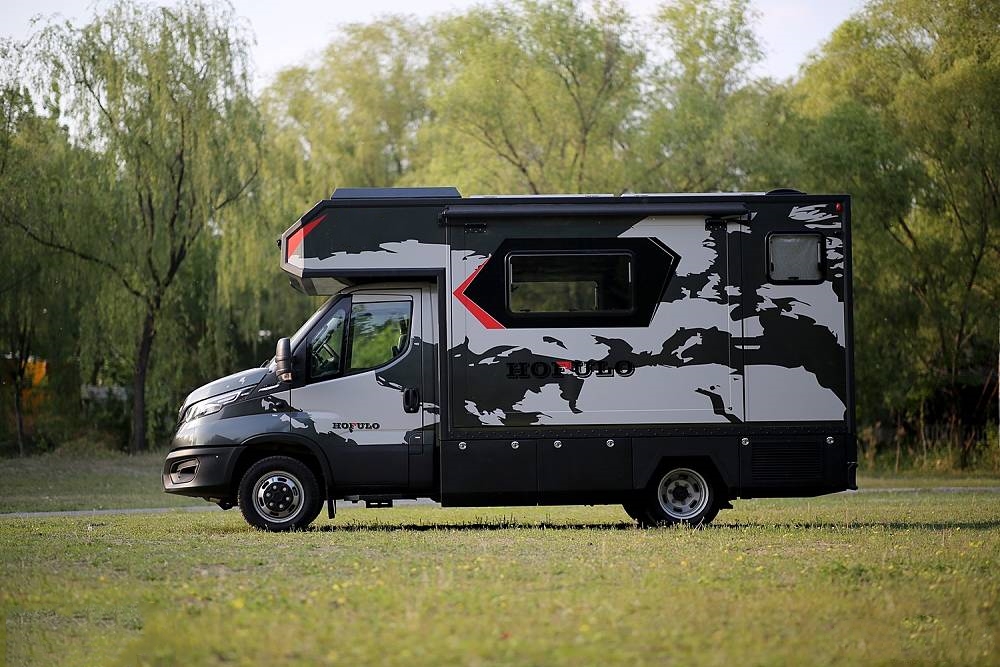 面對市場上眾多同級C型競品房車,論及拉花、彩條以及車身涂裝的個性化制作,依維柯這款全新車型絕對榜上有名。雖然進口依維柯底盤只是后驅系統,但這種足夠野性、也足夠讓人一見就能傾心的硬朗氣息,不免會把它當做四驅越野房車來對待。為了降低車身整體高度,勇者房車將軟升頂機構植入C型額頭位置,這樣它的最大高度控制在2990mm。