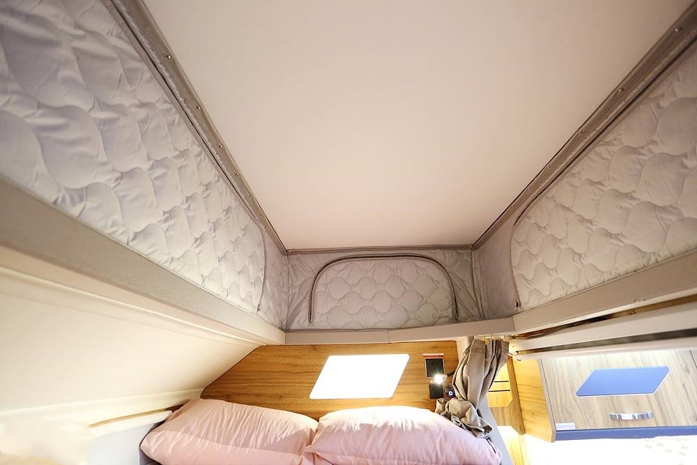 房車額頭部分采用獨家開發的局部升頂結構,不但賦予整車良好的通過性,更保障了額頭床的使用空間和駐車通透感。升頂部分采用雙層帳篷結構,外層為高質量透氣防雨布,內層為舒適海綿保溫層,通透性與保溫性兼具。當然,還能通過篷布窗戶進入到車頂位置,這樣更適合那些站在高處拍照的攝影愛好者,或者定期到車頂清理太陽能板的灰塵。