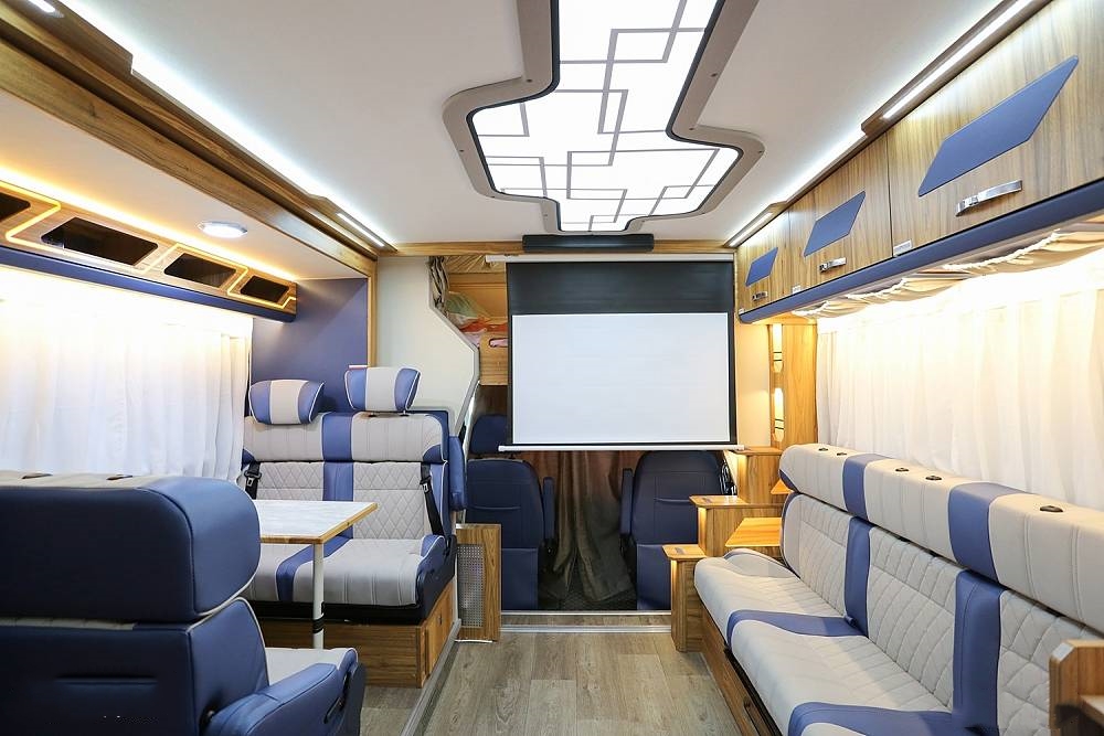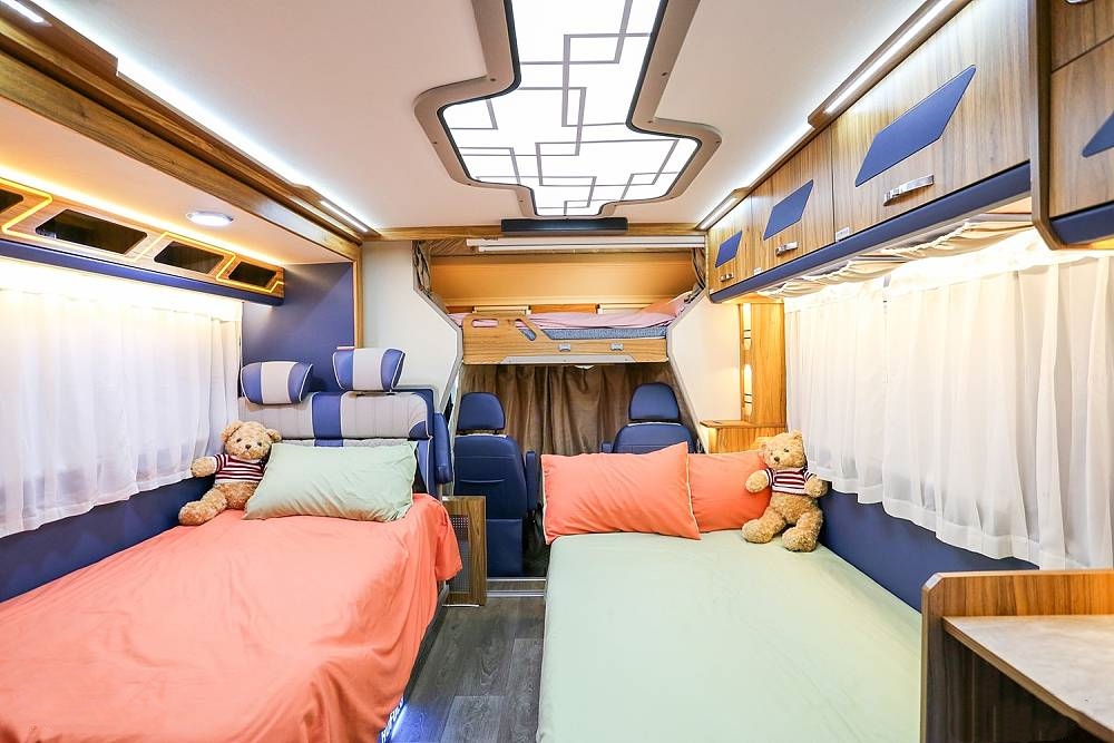 內飾方面,勇者房車內部采用藍白內飾風格作為全新的設計,有點海洋系的感覺。整體感覺來說,白藍配色觀感清新,加上原木色的板材飾面,更加原生態。吸頂式造型頂燈與四周吊柜造型相呼應,頂燈與氛圍燈帶相襯托的整體燈光效果,使得夜晚的車內空間充滿了居家溫馨感。布局方面,整車以額頭床+中置長條沙發+4人會客區+車尾廚房+衛生間布局,對于這款布局我們比較常見,但對于勇者這款房車來說,是第一次嘗試,側向沙發和4人會客區座椅全部來自于乘用車的座椅標準,安全性上得到了保證。