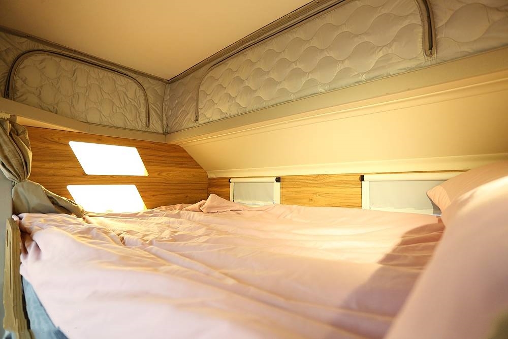 再來看看這款搭在額頭區域的“帳篷床”,它的尺寸為1950×1200(mm),睡在這里可以不必再擔心一不小心抬頭就磕頭的風險,即便是挺直腰,頭頂的空間依然綽綽有余。平時不升頂前提下,額頭前側的兩張小側窗可以起到一定的采光作用。