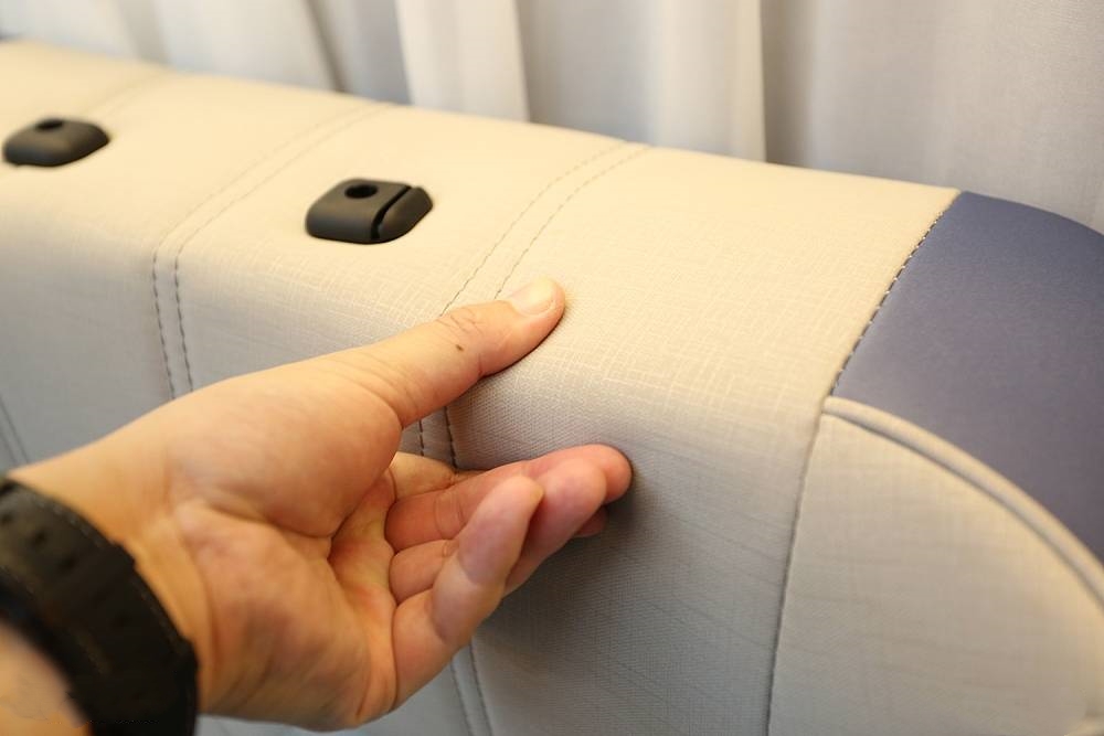 車內的沙發和座椅采用的是具有一定防水性的材料,摸上去有點偏光滑的感覺,后期清潔相對要容易很多。