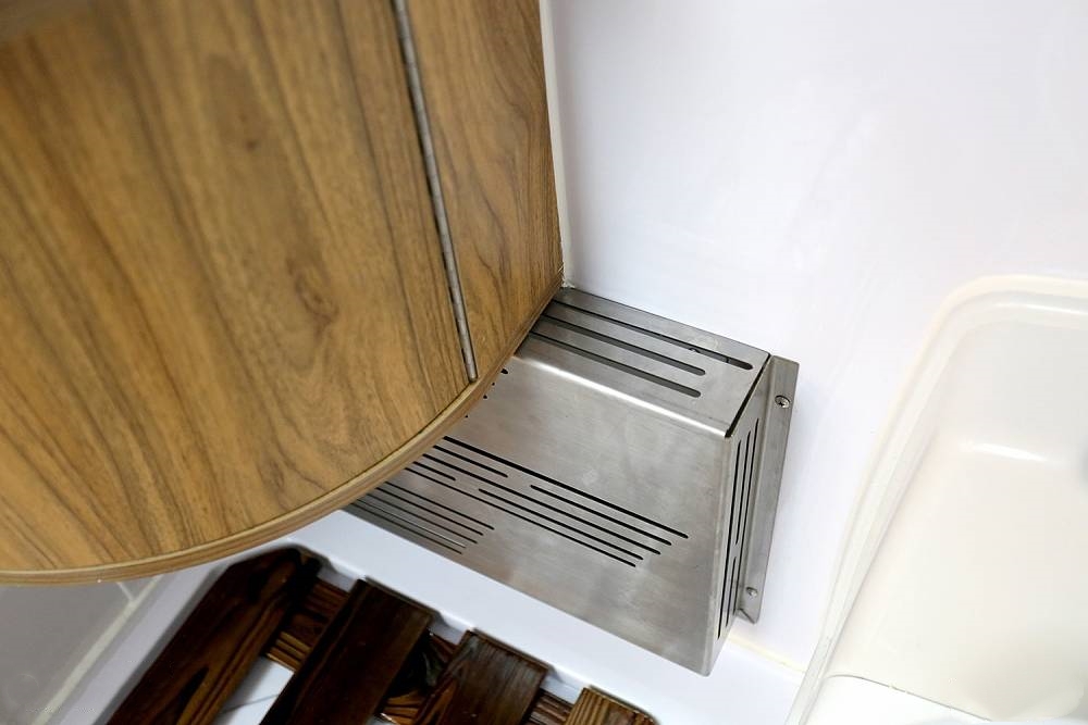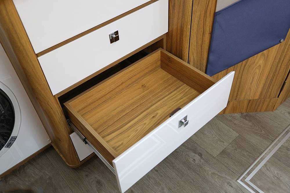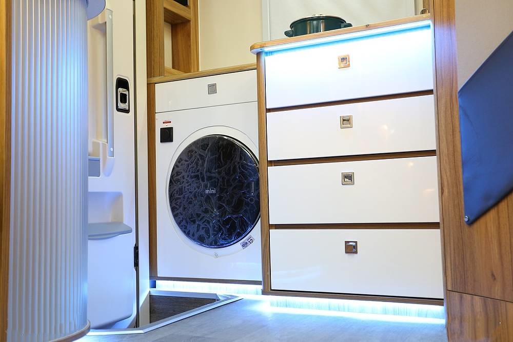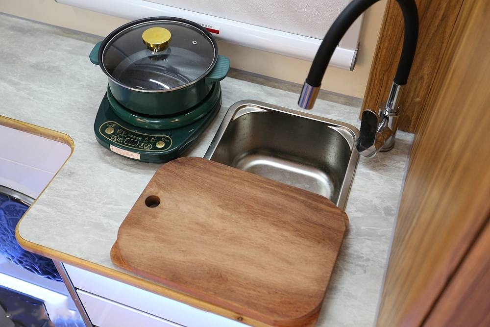廚房配備洗菜池、冷熱水龍頭、切菜板、活動式電磁爐、進口大宇微波爐。后上門布局的房車尾置廚房一般都采用異形的操作臺設計,留下的缺口由一塊折疊板進行填補,實際上操作臺的尺寸和補齊的整個操作臺大小一致。這款車將洗衣機也集成到了櫥柜之內,相對使用要便捷一些,在車外就能操作。另外,四層抽屜也提供了充分的儲物空間。