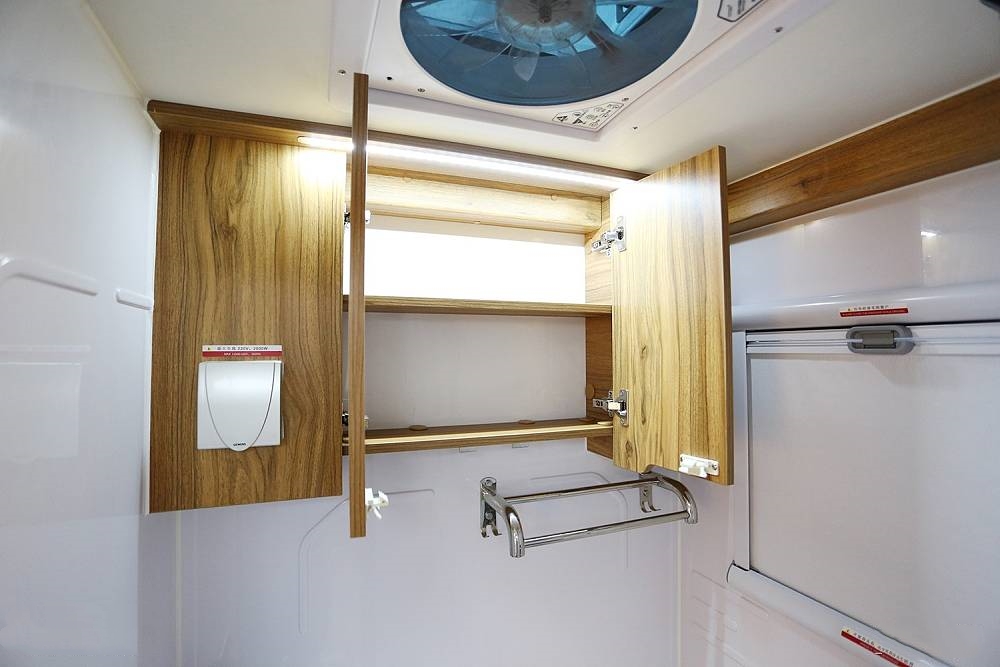 衛生間簡潔明了,搭配一款圓形陶瓷洗臉池、頂部雙向換氣扇、對開門洗漱品儲物格、毛巾架以及化妝鏡和獨立的淋浴花灑。水路系統方面,勇者房車配備的是230升凈水箱、80升熱水箱、95升灰水箱。