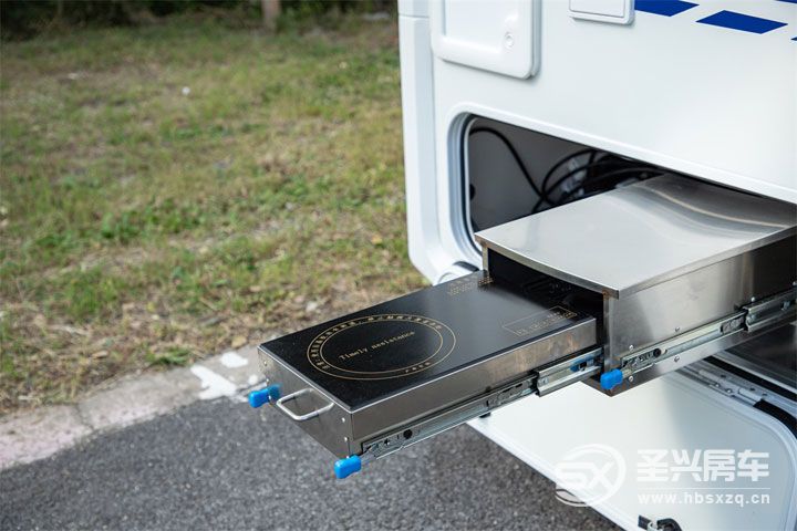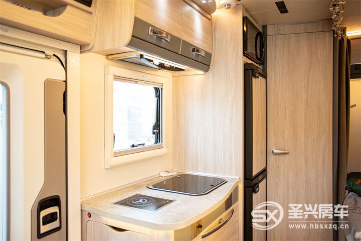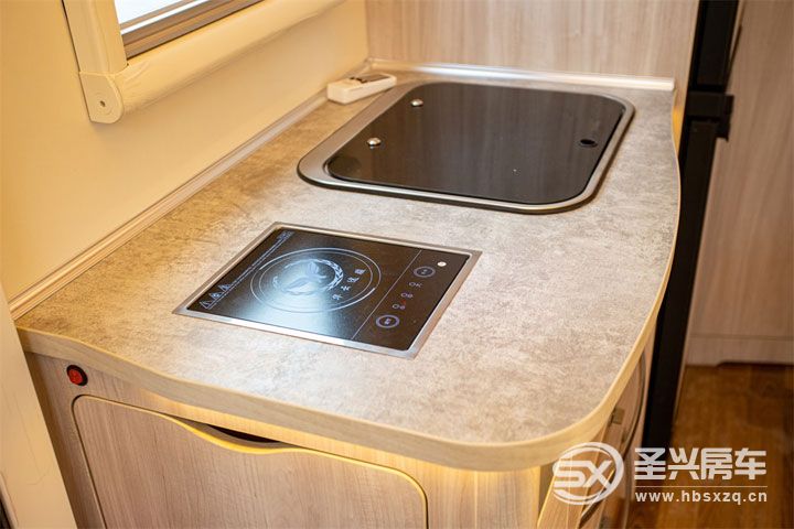 房車的內部廚房簡約卻不簡單,加長的操作臺、多功能金屬水槽、電磁爐、油煙機、微波爐、冰箱,一樣不少。既可以輔助室外廚房進行烹飪,也可以獨立制作簡餐。