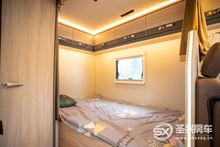 睡的舒不舒服永遠是房車用戶的第一個問題,這臺房車用的是后1900*1150(mm)縱置床+1900X1150(mm)吊床的配置,在輔助L型沙發滿足絕大多數家庭的訴求。
