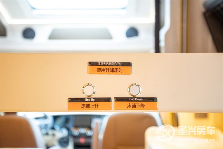 自行式C型房車中常見的額頭床部分,這里變成了讓房車更加舒適的采光窗和抽拉式儲物空間。