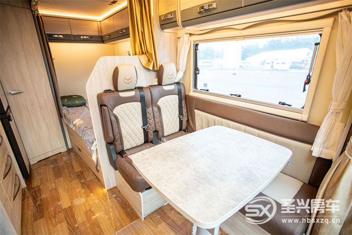 這臺S800在布局方面選擇了經典的后縱置床+吊床,在空間的利用和床位的數量上都有著獨特的考量。然后利用采光和木色紋理的暖色調讓旅行生活中充滿了活力和新鮮感。