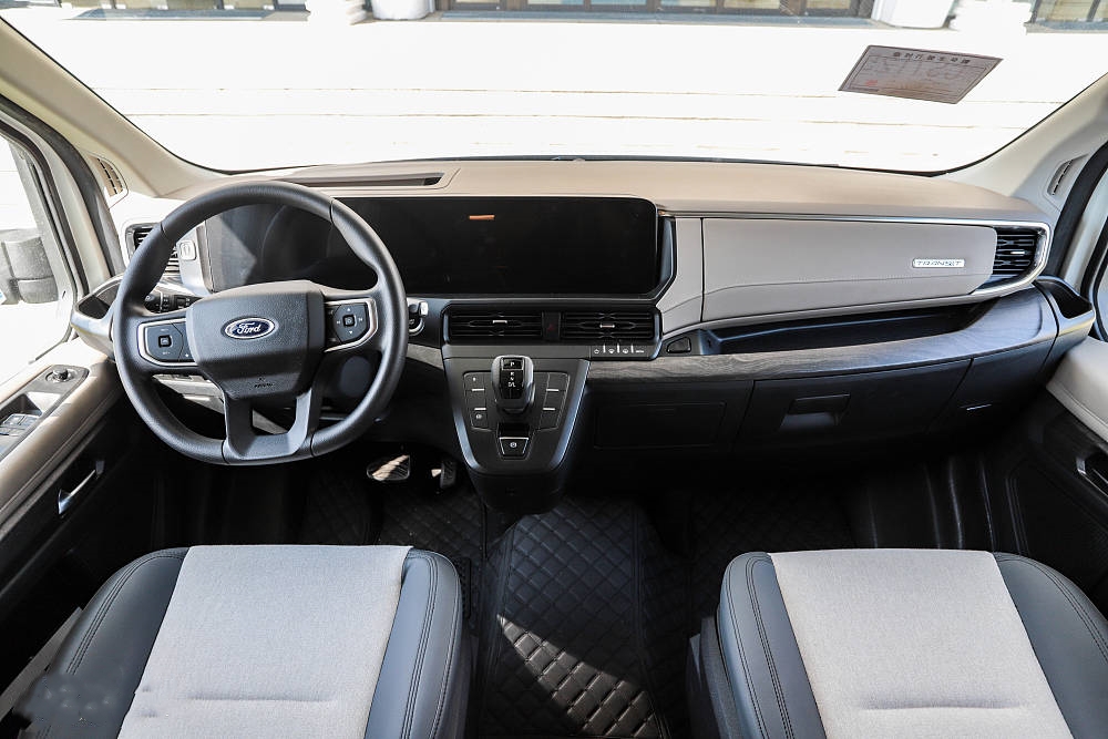 駕駛室內飾設計可以用一個詞來形容,那就是“媲美家用車”,采用了雙聯屏設計,分別是12.3英寸的中控觸摸屏和12.3英寸的全液晶儀表盤,這在輕客市場上是比較罕見的。除了雙聯屏,內飾細節中還有很多細節值得稱贊的點,比如,方向盤采用了三輻式設計握感舒適,座椅也非常考究,可以說是輕客市場上的一股清流,它不僅擁有豐富的科技配置,還有優雅的設計風格,讓駕駛員和乘客都能擁有堪比家用車的舒心用車體驗。