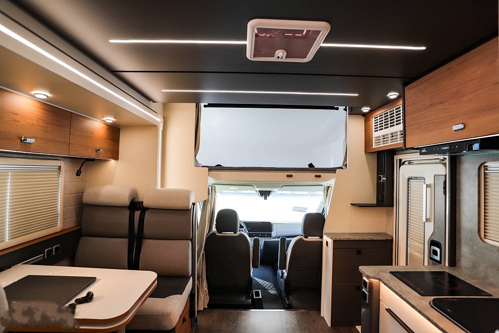 設計拓展機構的妙處在于,駐車時車廂面積得以最大化拓展。只需按鍵操作拓展艙便徐徐伸出,將房車內部空間瞬間打造成一個寬敞舒適的居家環境。此時,會客區域、開放式廚房以及床鋪休息區都擁有了更多的活動空間,仿佛將家搬到了戶外。而當駕駛或泊車之時,只要一鍵收回拓展艙,就能緊湊如常,絲毫不影響行駛或停靠的便捷性。