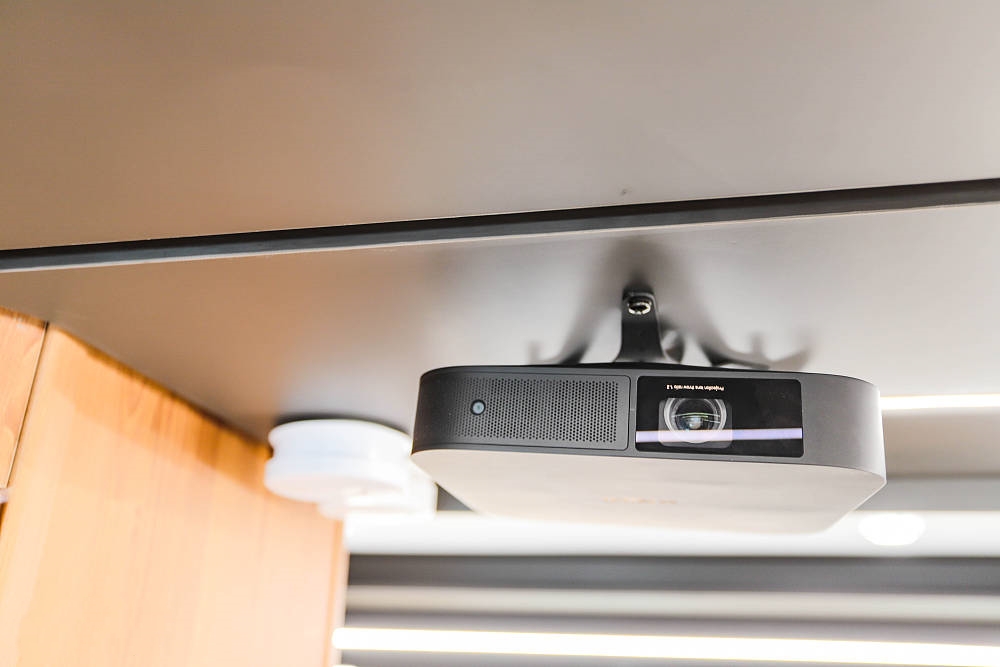 得益于雙拓展的寬大空間尺度,車廂娛樂主要靠一臺極米投影儀與60寸電動投影幕的組合,可讓房車瞬間變身娛樂空間和移動影院。