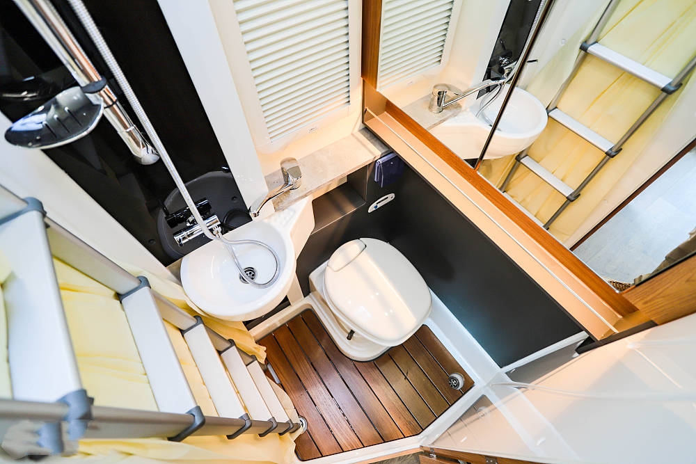 會客區橫向空間表現優異,餐桌表面是白色原木紋理并配備延長桌板,打開后更方便日常就餐娛樂;雙卡座沙發座椅下方內有乾坤,各內置一組大容積抽屜,充分利用零散空間提升儲物效率。餐桌降低后還可與沙發組合成一張臨時床鋪使用,超大尺寸外推窗為客廳提供足夠的采光和通風效果,同時也可以欣賞車外的風景,為旅途增添樂趣。