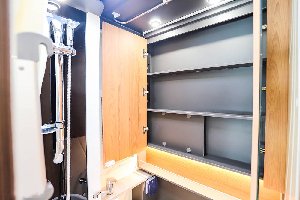 尾部拓展增加了車長,藍牌房車亦可擁有寬闊雙人床,提供一張2.1米*1.9米的超寬雙人床,室內設計貼心溫馨,仿佛家中臥房一般。旅途與居家體驗再難區分,讓每一次旅程都成為您生活中的一部分。橫置大床布局能保證舒適的睡眠空間和充足的儲物空間。床鋪兩側設有外推窗,為臥室提供良好的采光和通風效果,上方的多組儲物衣柜方便收納衣物和其他物品。