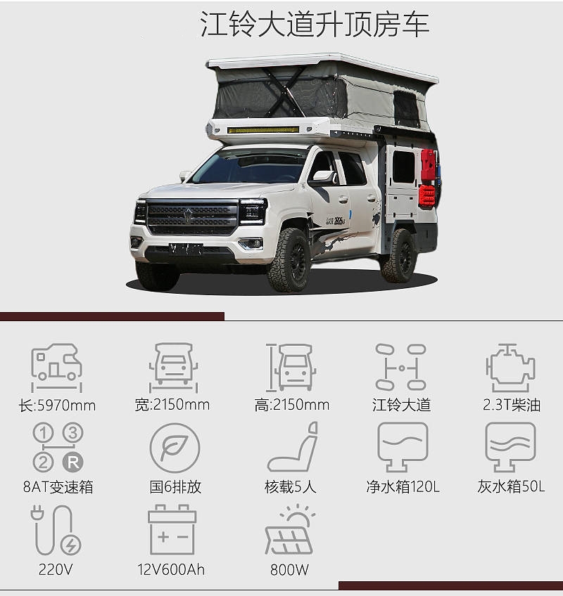 江鈴大道是近段時間熱度高漲的房車底盤之一,硬派的外觀設計、高性價比高,江鈴大道房車正是基于該底盤打造,升頂結構進一步增加車內頭部空間。