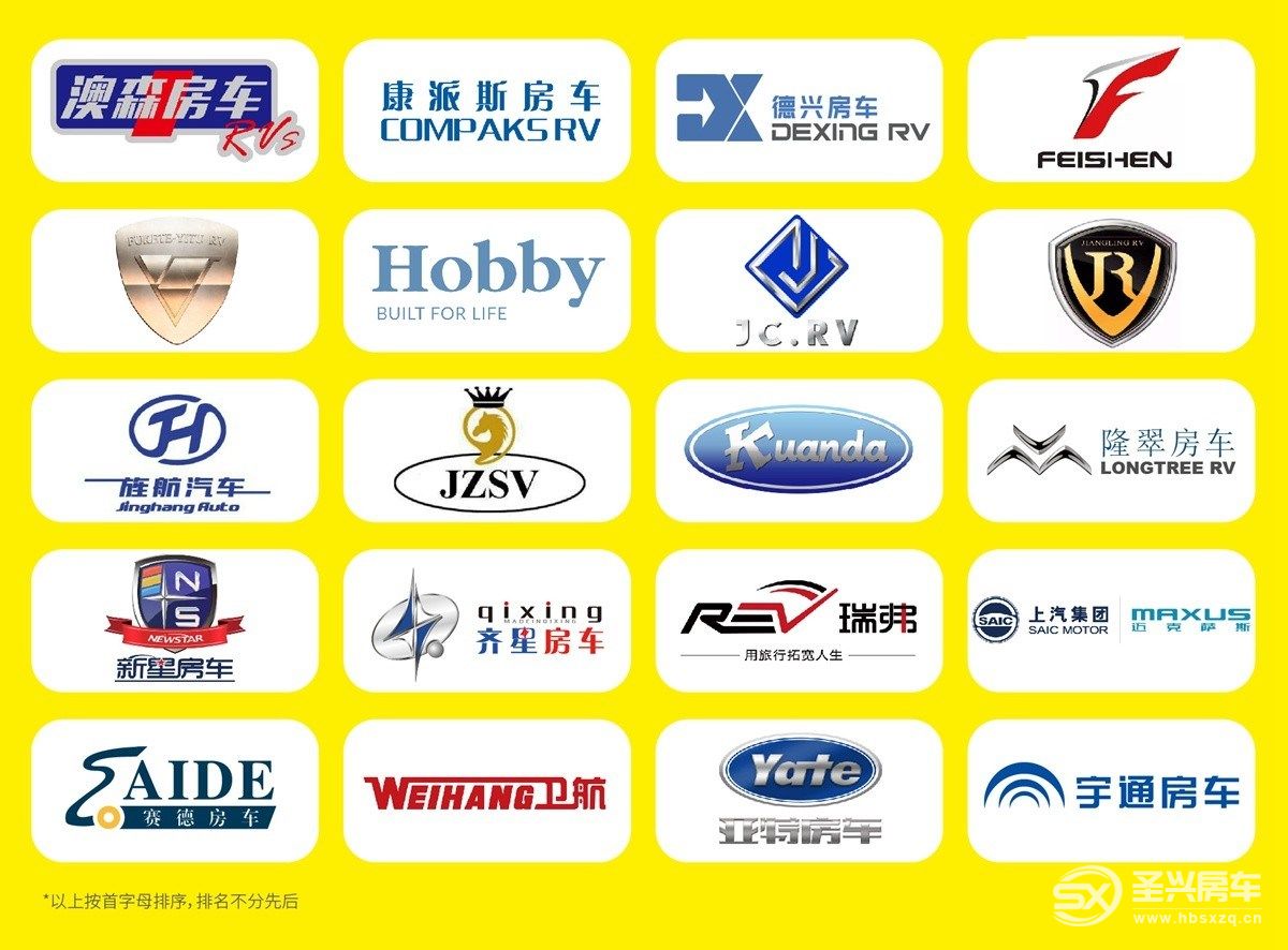 澳森拖掛房車、德興房車、飛神房車、福客特房車、Hobby進口拖掛、駿馳房車、江鈴房車、旌航房車、佳卓房車,寬大房車、康派斯越野拖掛、隆翠房車、齊星房車、瑞弗房車、賽德房車、上汽大通、衛航房車、新星房車、亞特房車、宇通房車。(以上排名按首字母排序)。