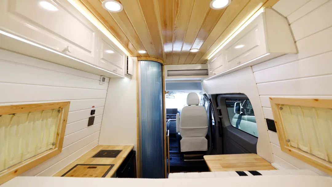 來到車內(nèi),這款是主流的露營車裝飾風(fēng)格,實木條裝飾側(cè)壁和天花板,燈光系統(tǒng)選用燈帶結(jié)合小圓形頂燈的組合,車內(nèi)的燈光亮度非常高,這是我體驗之后非常喜歡的一點。布局也非常簡單,駕駛室后方是一款中前置的衛(wèi)生間,中部是廚房和中置小客廳,車尾就是一張可靈活轉(zhuǎn)換的大雙人床。如此一來,整車可以做到核載4人,滿足2人睡眠。
