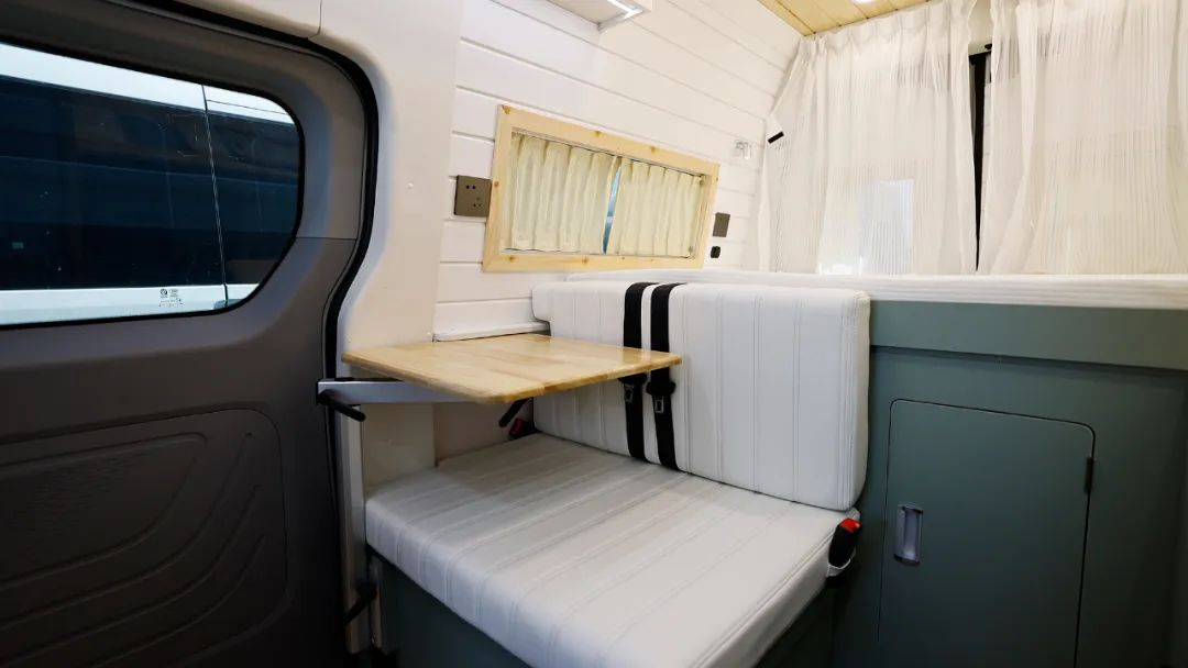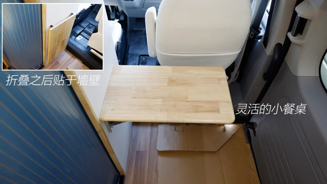 副駕駛席后方是一款貼合于衛(wèi)生間側(cè)壁板的小餐桌,當(dāng)副駕駛席旋轉(zhuǎn)至后方的時候后方的折疊餐桌可以作為一款小茶臺使用,日常不使用的時候也不影響用戶上下車。