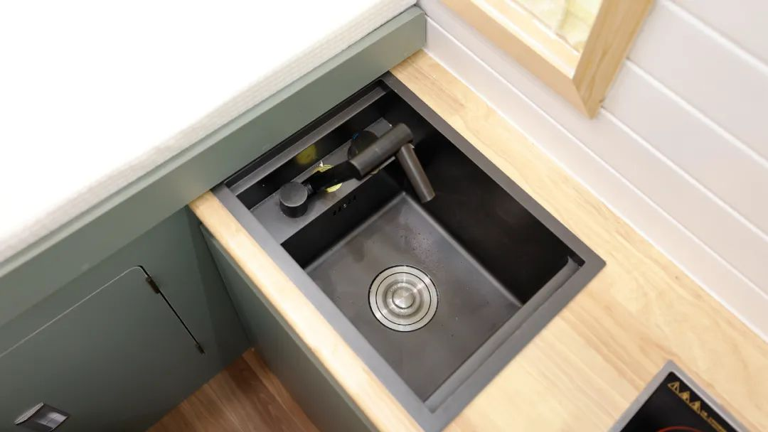廚房位置介于衛(wèi)生間和后床之間,廚房臺面適中,畢竟作為一款緊湊型的車型,滿足了各項配置,它的空間就會被壓縮。廚房操作臺上配備了一款比較實用的方形洗菜池,深度不錯,多角度可調(diào)節(jié)的水龍頭也比較實用。臺面的右側(cè)是一款800W電磁爐,用于日常燒水或者是煮面等簡餐使用,重油煙的烹飪還是放在車外吧!櫥柜之內(nèi)包含了一個單間儲物格和一款70升車載冰箱,滿足于日常的儲物和保鮮。