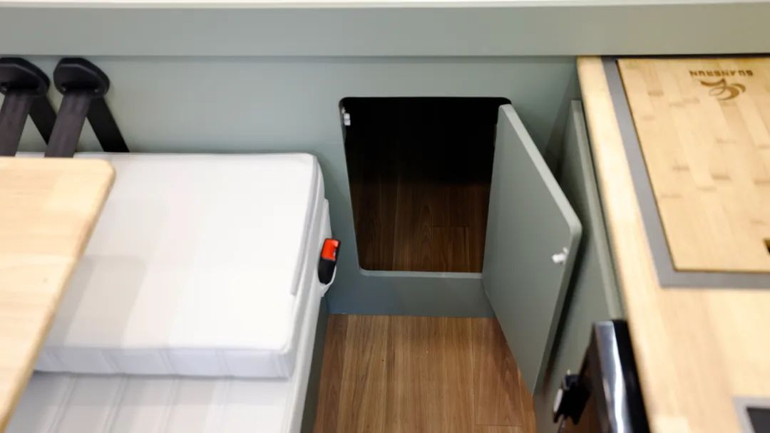 車內(nèi)最大的儲物艙位于后床的床底座之內(nèi),我們在生活區(qū)設(shè)有開口,方便拿取行李物品,當(dāng)然更大尺寸的行李物品,則需要打開后門才能操作。