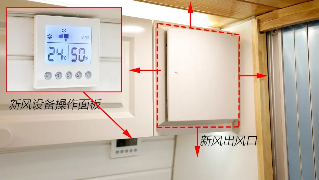 考慮到車內(nèi)四周的環(huán)窗無法打開,便于車內(nèi)空氣流通,在廚房頂部的吊柜組之內(nèi)安裝了一款新風(fēng)設(shè)備,可以緩解車內(nèi)的空氣流速。其實,按照我個人的使用習(xí)慣來說,車頂開設(shè)一個天窗可能會更好些。