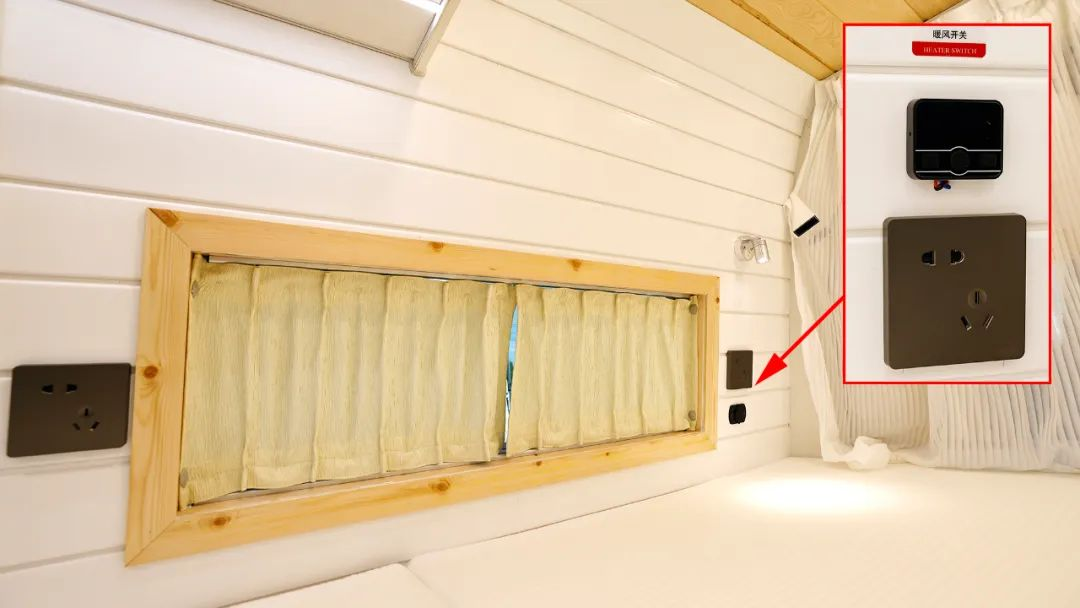對于晚上使用充電設(shè)備的,床頭一側(cè)配備了兩組220V電源輸出插座,暖風(fēng)設(shè)備的開關(guān)也在床頭便于打開和關(guān)閉。