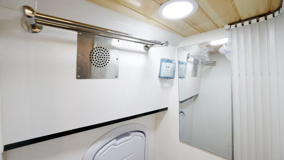 考慮到一些年輕女性用戶的使用,這款B房車給用戶配備了固定衛(wèi)生間,推拉門式的設(shè)計,內(nèi)部包含了一款便攜式馬桶,折疊洗臉盆,化妝鏡、毛巾架,換氣扇,內(nèi)部空間剛好容納一名成年人,空間雖然緊湊了一些,不過車內(nèi)的設(shè)施比較完善,實際用車過程中的體驗也要好一些。水路部分,這款車80升凈水箱,10升電熱水器。